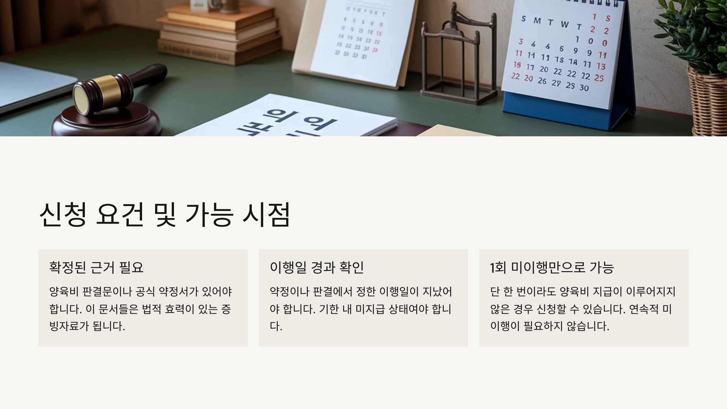 A1. 법적 효력을 가진 문서(판결문, 조정조서 등) 기준으로 정해진 날짜까지 양육비가 지급되지 않았을 때 바로 신청 가능해요. 1회 미지급만으로도 가능합니다.