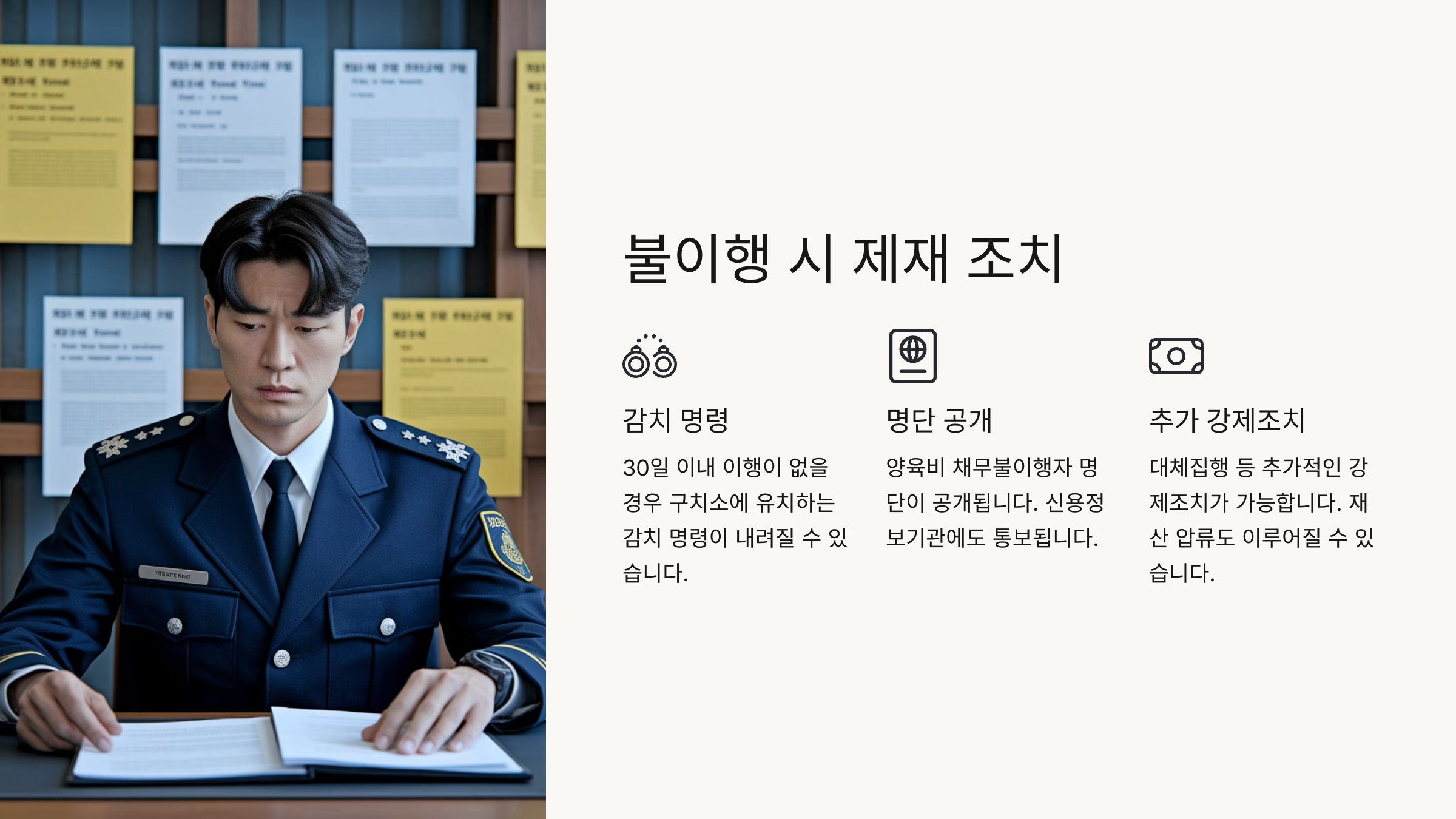 양육비 이행명령을 받았음에도 불구하고 지급하지 않으면, 법원은 강제적 처벌 조치를 내릴 수 있어요. 이는 단순히 양심의 문제가 아니라, 아동의 생존과 복지와 직결되기 때문에 우리 법도 엄하게 보고 있어요.
