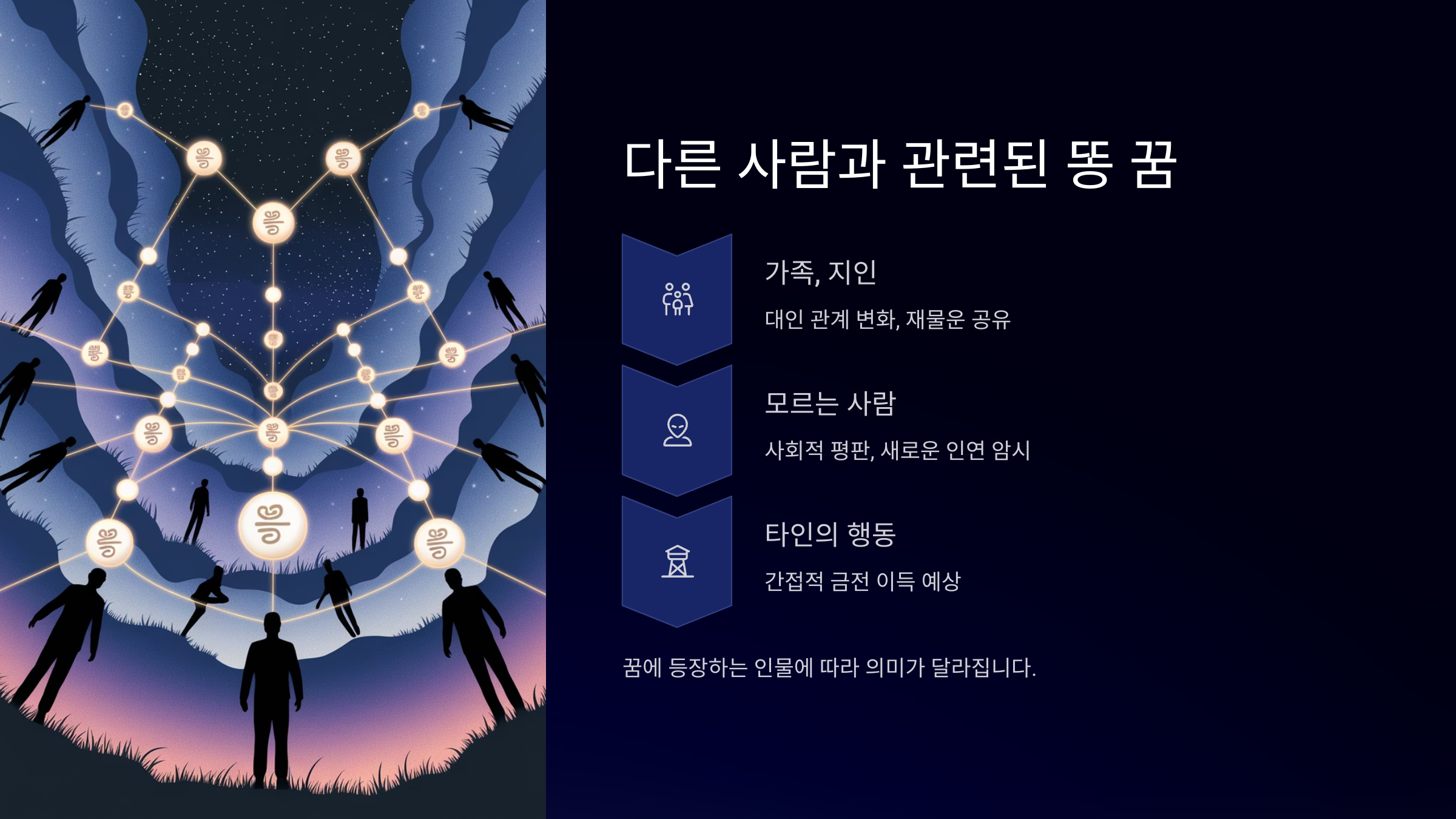 꿈에서 내가 아닌 다른 사람이 똥을 싸는 장면을 보거나, 타인과 함께 똥이 등장하는 꿈은 관계의 흐름, 타인의 영향력, 혹은 나와 타인 사이의 에너지 교환을 상징해요. 단순히 '더럽다'고 넘기지 말고, 그 사람과의 관계를 떠올려보는 게 중요해요.