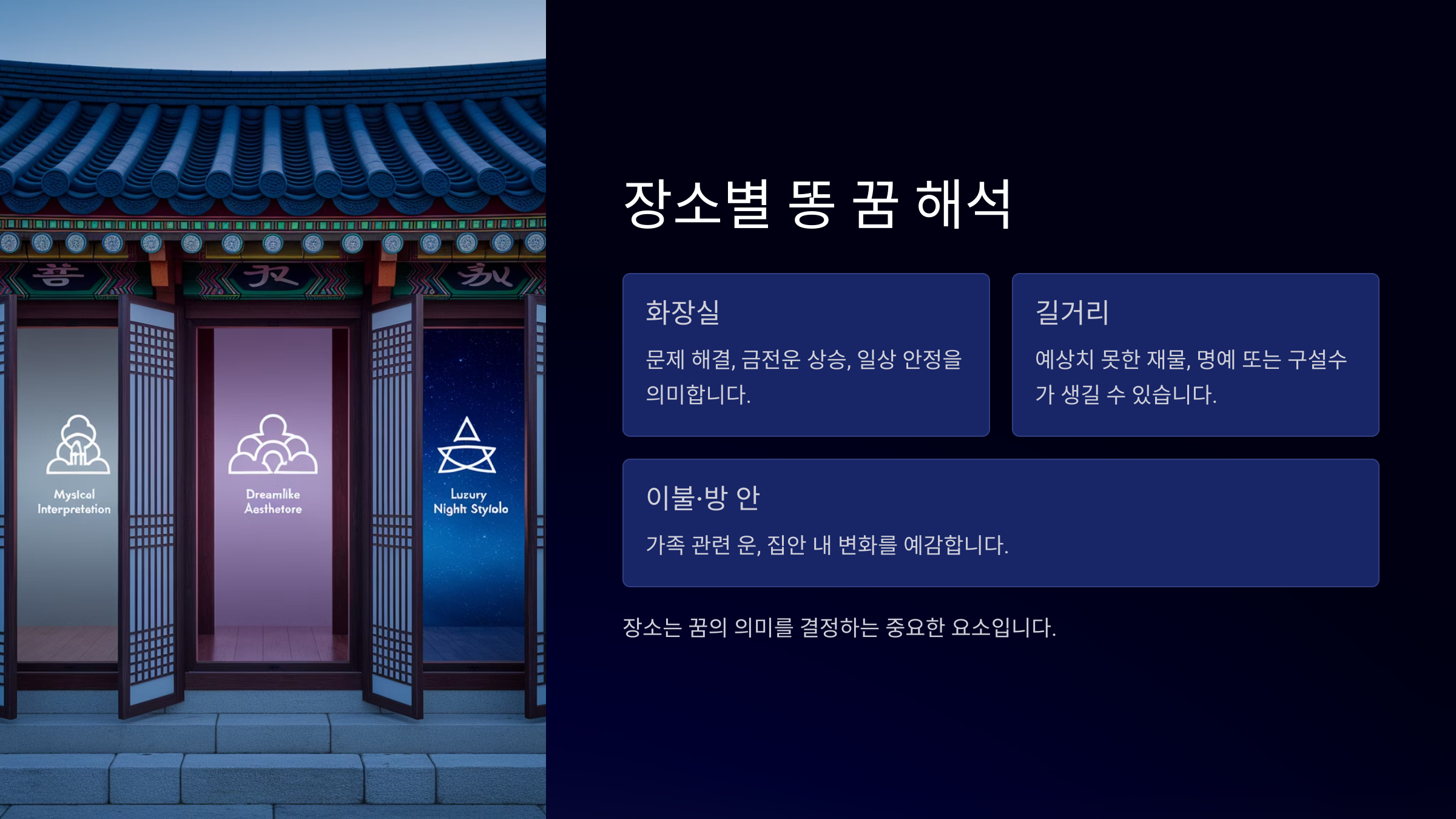 꿈속에서 똥을 어디서 싸느냐에 따라 해몽의 의미는 꽤 많이 달라져요. 같은 똥 싸는 행위라도 장소에 따라 상징하는 메시지가 전혀 다를 수 있답니다. 이번 섹션에서는 대표적인 장소별 똥 꿈을 하나씩 풀어볼게요. 💩