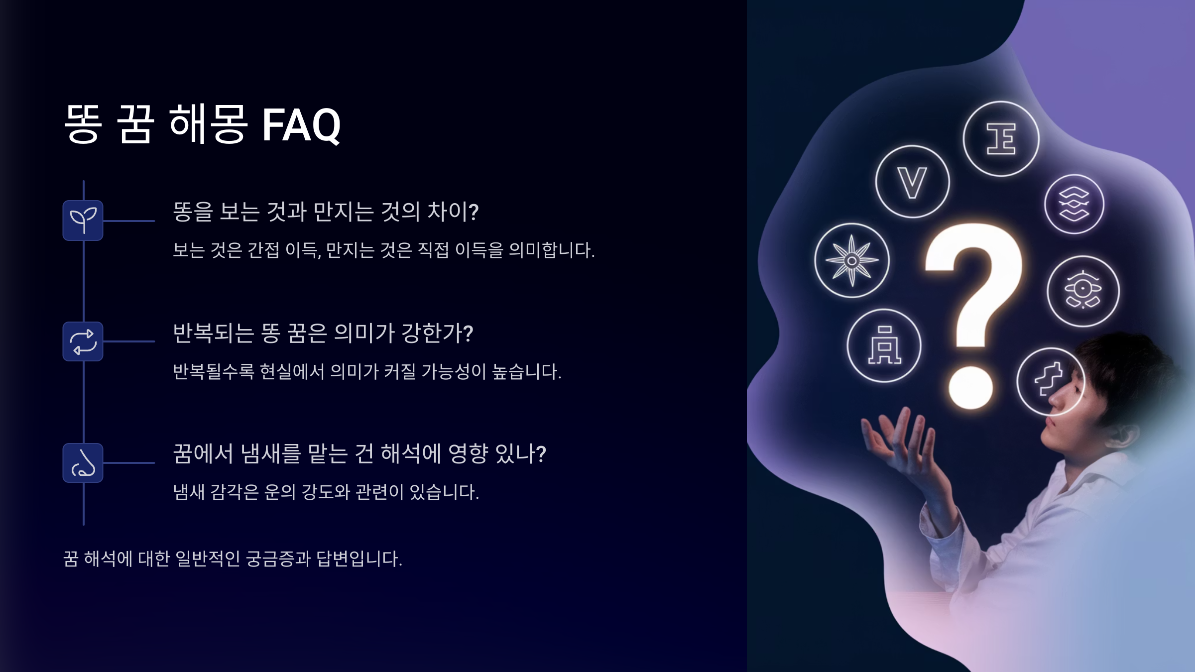 요약하면, 똥 싸는 꿈은 대체로 금전운 상승의 대표적 상징이에요. 하지만 언제나 꿈의 해석은 맥락에 따라 달라지니, 본인의 상황과 감정에 비추어보는 게 중요해요. 꿈은 가끔 내 마음이 먼저 아는 조짐이기도 하니까요! 😊