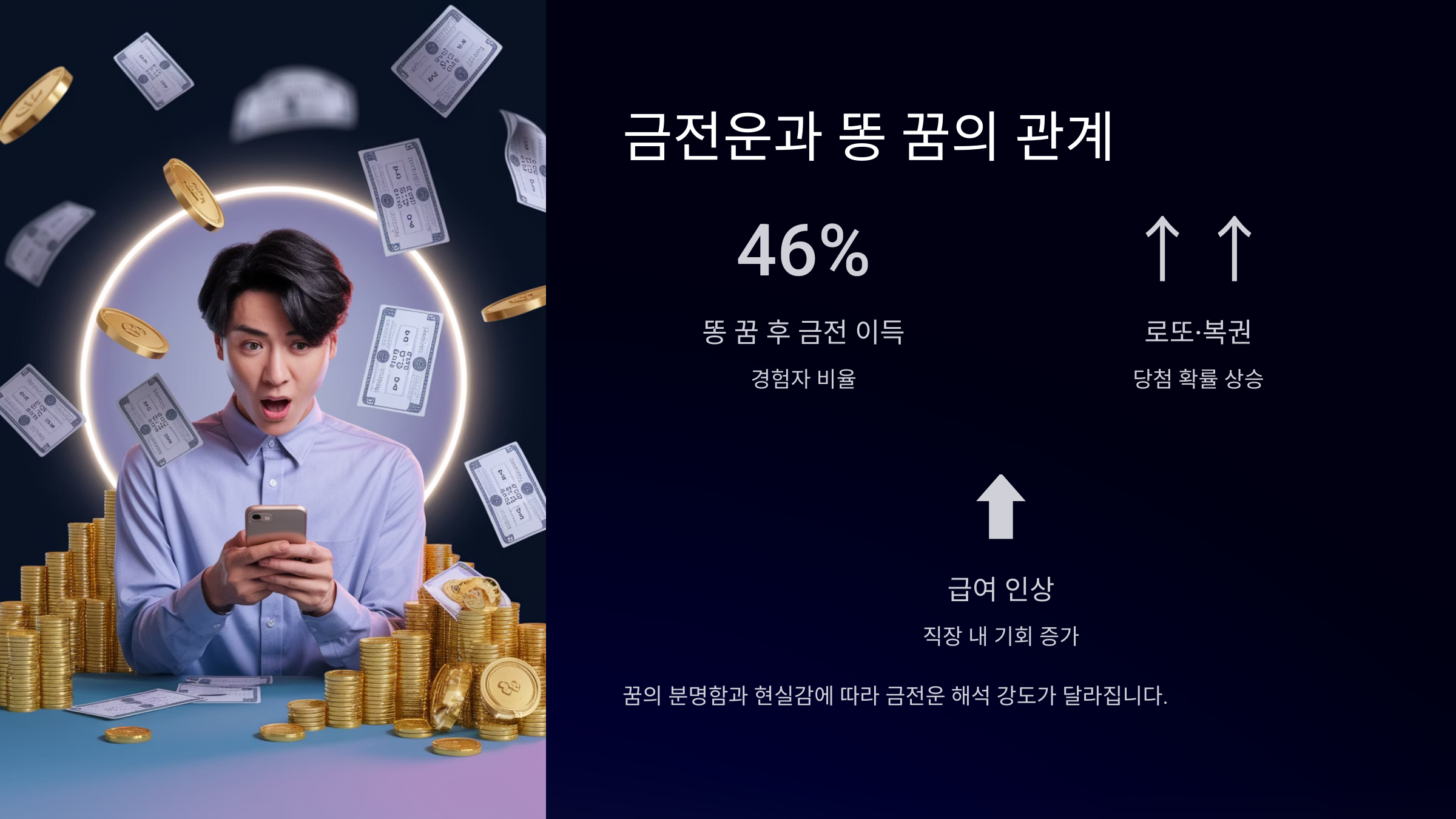 특히 요즘처럼 부동산, 주식, 코인 등 재테크에 관심이 많을 때 이런 꿈을 꾸게 되면 '심리적으로 수익을 원하고 있다는 상태'가 반영된 것이기도 해요. 실제 금전 상황뿐 아니라 내 마음속 금전 욕망이 드러나기도 하는 거죠.