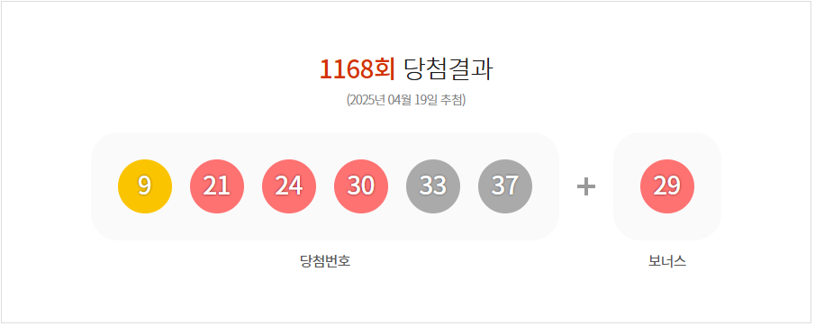 1168회 로또 추첨은 2025년 4월 19일(토)에 진행되었고, 행운의 번호는 9, 21, 24, 30, 33, 37번으로 발표됐어요. 그리고 2등 보너스 번호는 29번이었죠.