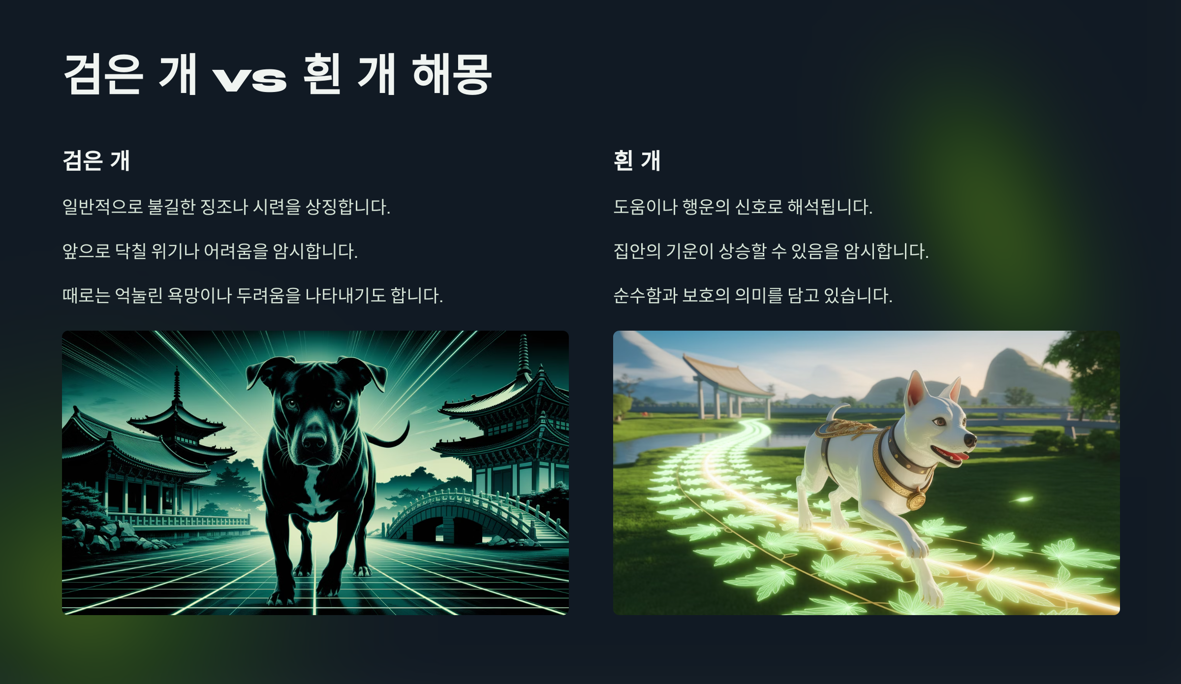 꿈에 등장한 개의 색깔은 그 자체로 상징을 품고 있어요. 특히 검은 개와 흰 개는 정반대의 해석을 갖는 경우가 많아요. 개에게 물리는 꿈이더라도 어떤 색이었느냐에 따라 길몽인지, 흉몽인지 달라질 수 있답니다.