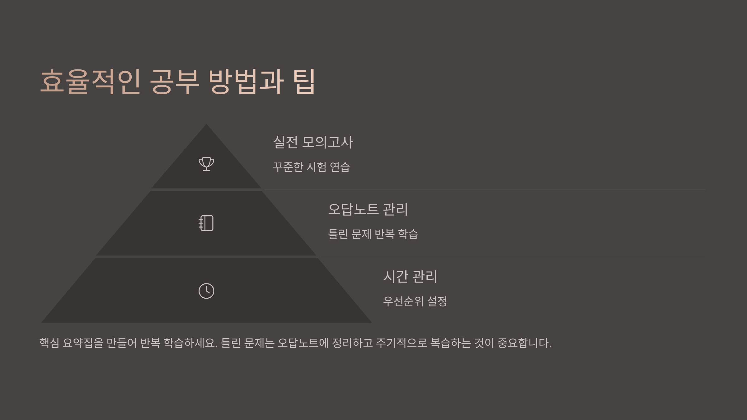 이 팁들을 자신의 공부 스타일에 맞게 적용해보면 분명 성과가 달라질 거예요. 공부량이 많다고 무조건 합격하는 건 아니니까, 효율적인 방법으로 시간을 아끼는 게 가장 똑똑한 전략이에요. 다음은 멘탈관리와 동기 부여 파트로 넘어가볼게요! 😄