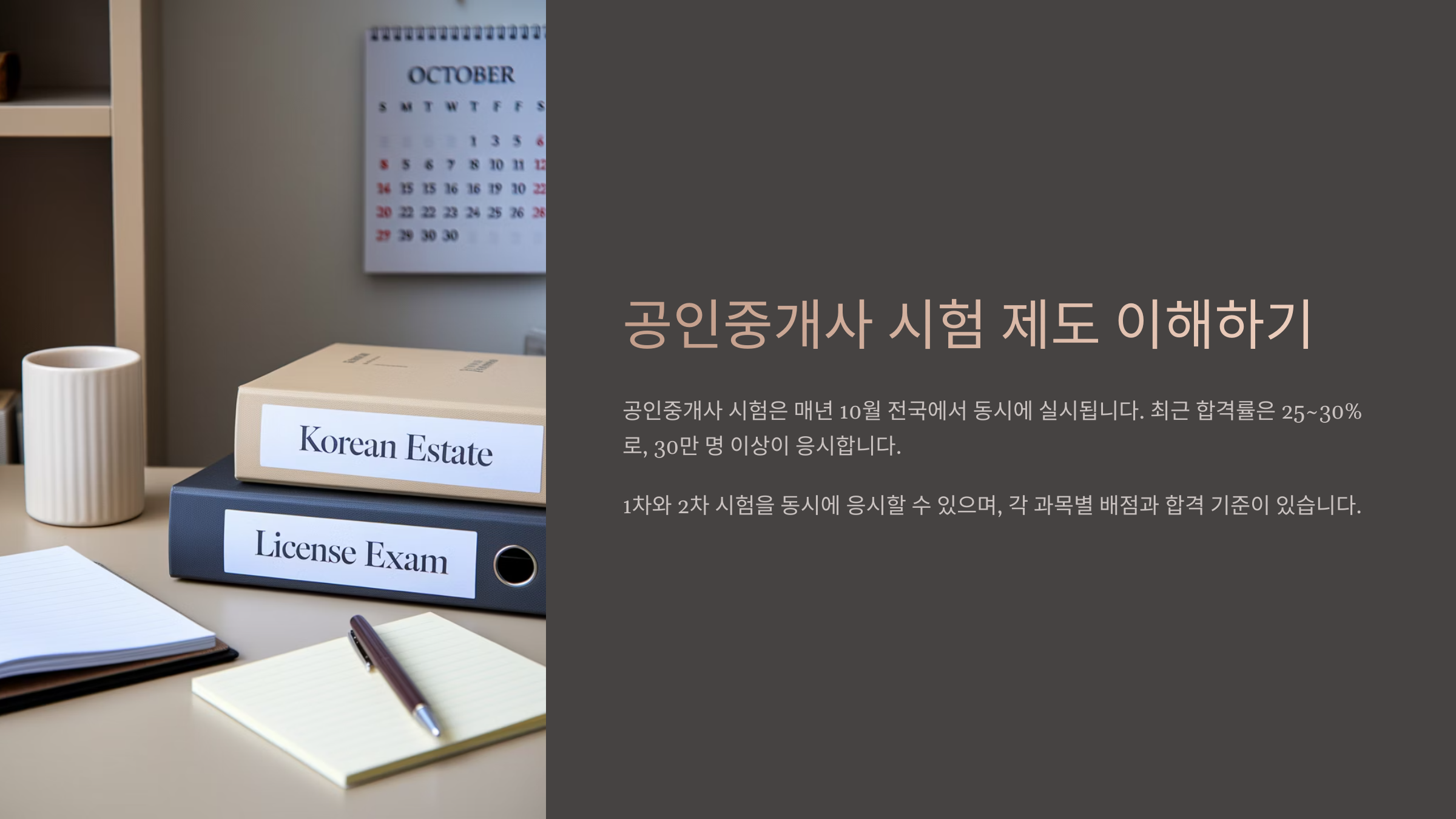 공인중개사 시험은 부동산 중개업에 종사하기 위한 국가 자격시험이에요. 이 시험은 국토교통부가 주관하고, 한국산업인력공단에서 시행하는 국가 자격으로 매년 1회, 10월에 치러진답니다. 응시 자격은 따로 없어서 학력, 연령, 경력 상관없이 누구나 응시할 수 있어요.