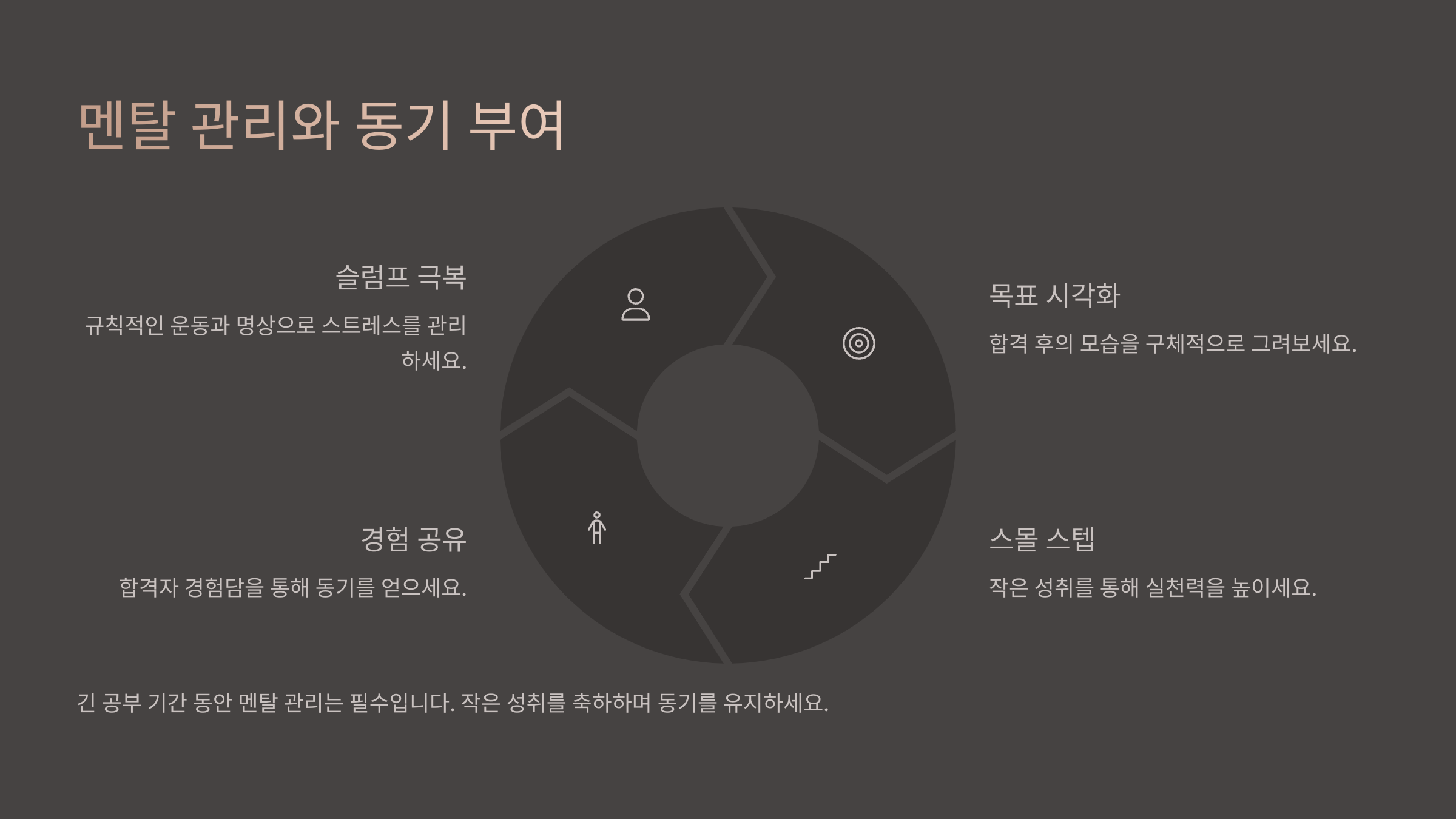 공인중개사 시험은 단거리 경주가 아니라 마라톤이에요. 길게는 1년 가까이 공부를 해야 하다 보니, 중간에 슬럼프가 오거나 지칠 수밖에 없죠. 이때 멘탈을 잘 관리하고 동기를 유지하는 게 정말 중요해요. 합격은 의지의 싸움이기도 하니까요! 🎯