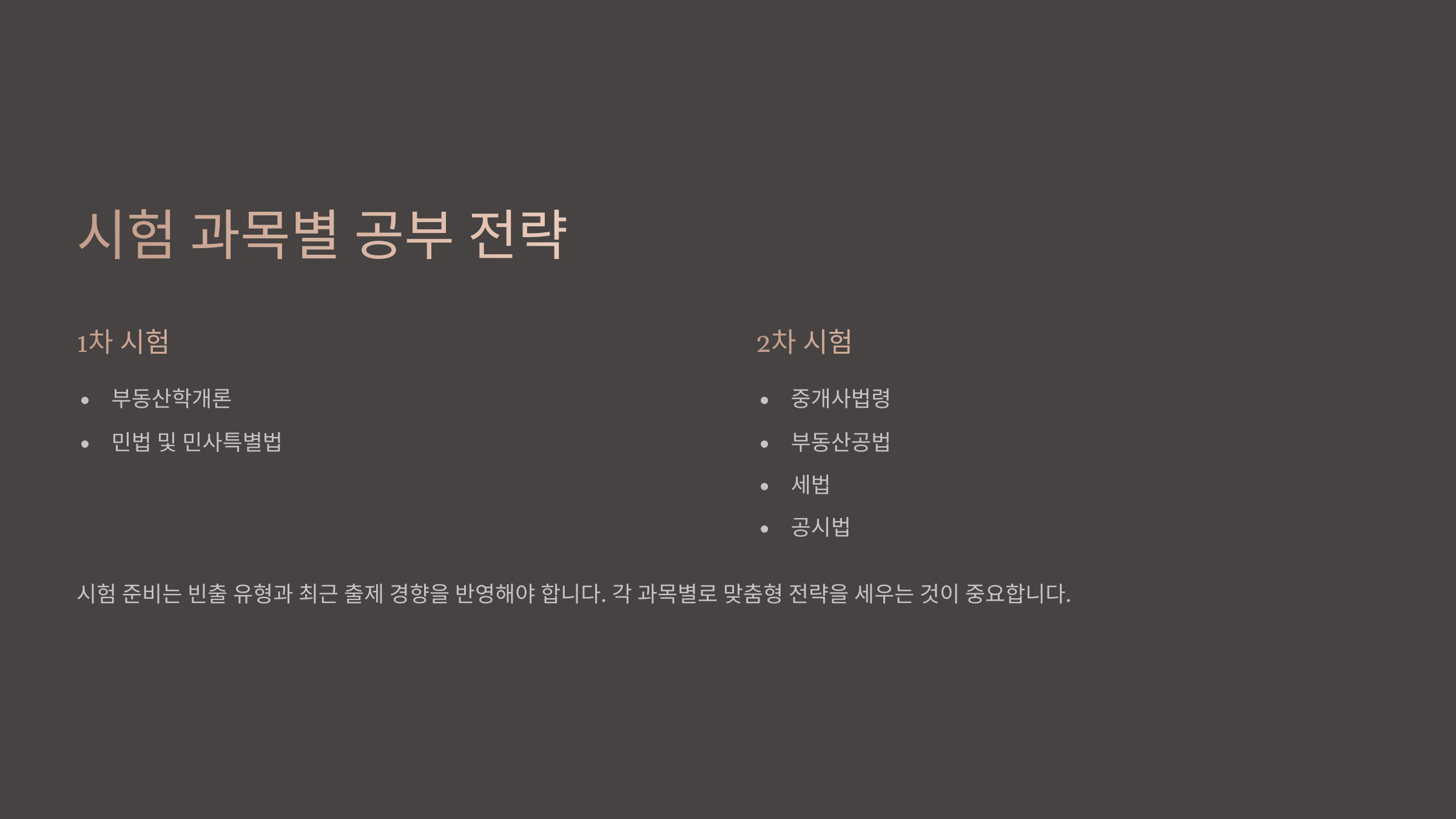 이처럼 공인중개사 시험은 제도적으로 잘 갖춰져 있고, 누구에게나 열려 있는 기회라서 준비만 잘하면 좋은 결과를 얻을 수 있어요. 이제 과목별로 어떻게 접근하면 좋을지 알아볼까요? ✨