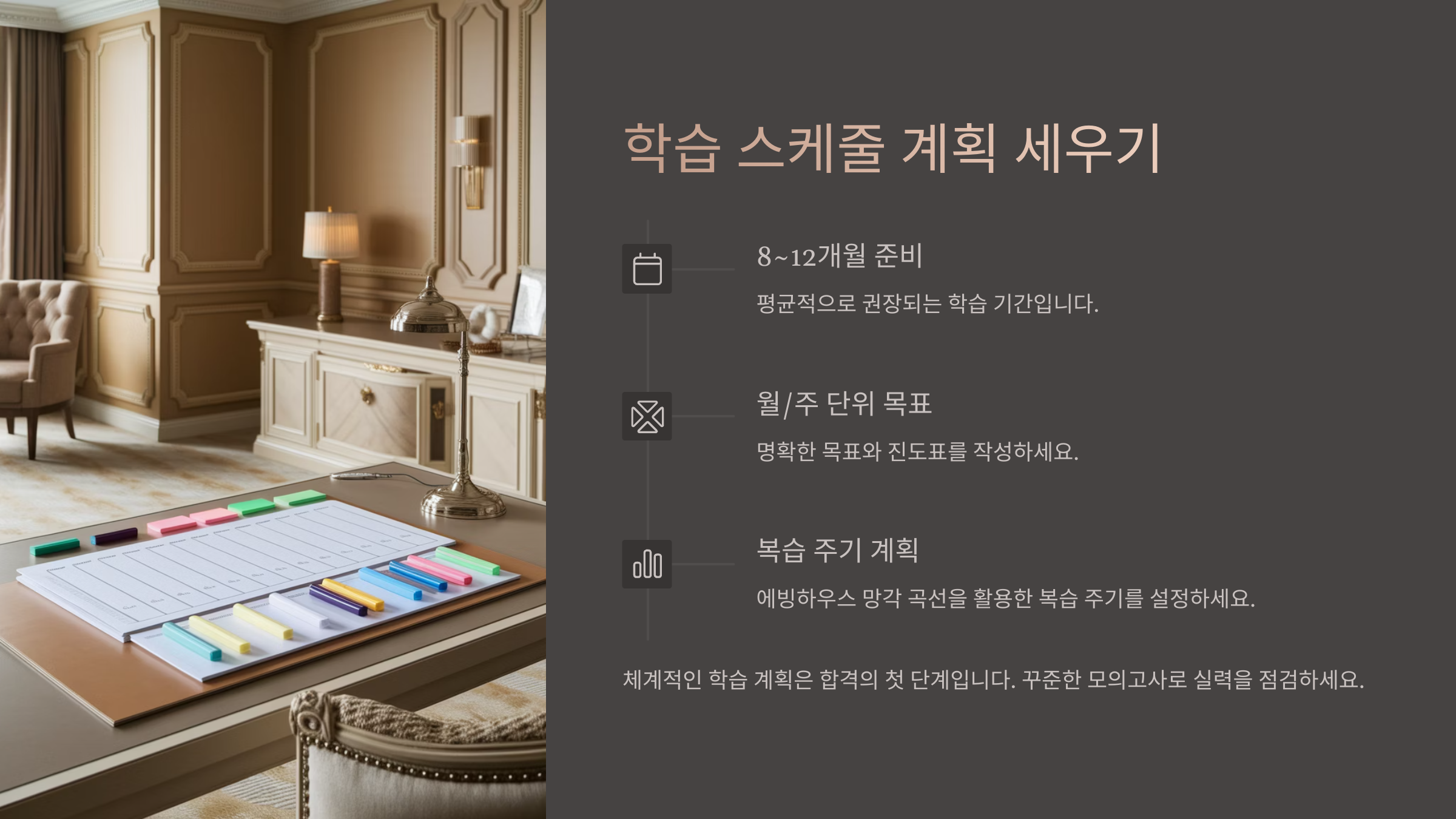 공인중개사 시험 준비에서 가장 중요한 건 ‘꾸준함’이에요. 하루에 얼마나 많은 시간을 투자하느냐보다도, 얼마나 오랫동안 꾸준히 공부하느냐가 승부를 가른답니다. 그러니 나에게 맞는 현실적인 스케줄을 짜는 게 무엇보다 중요해요.