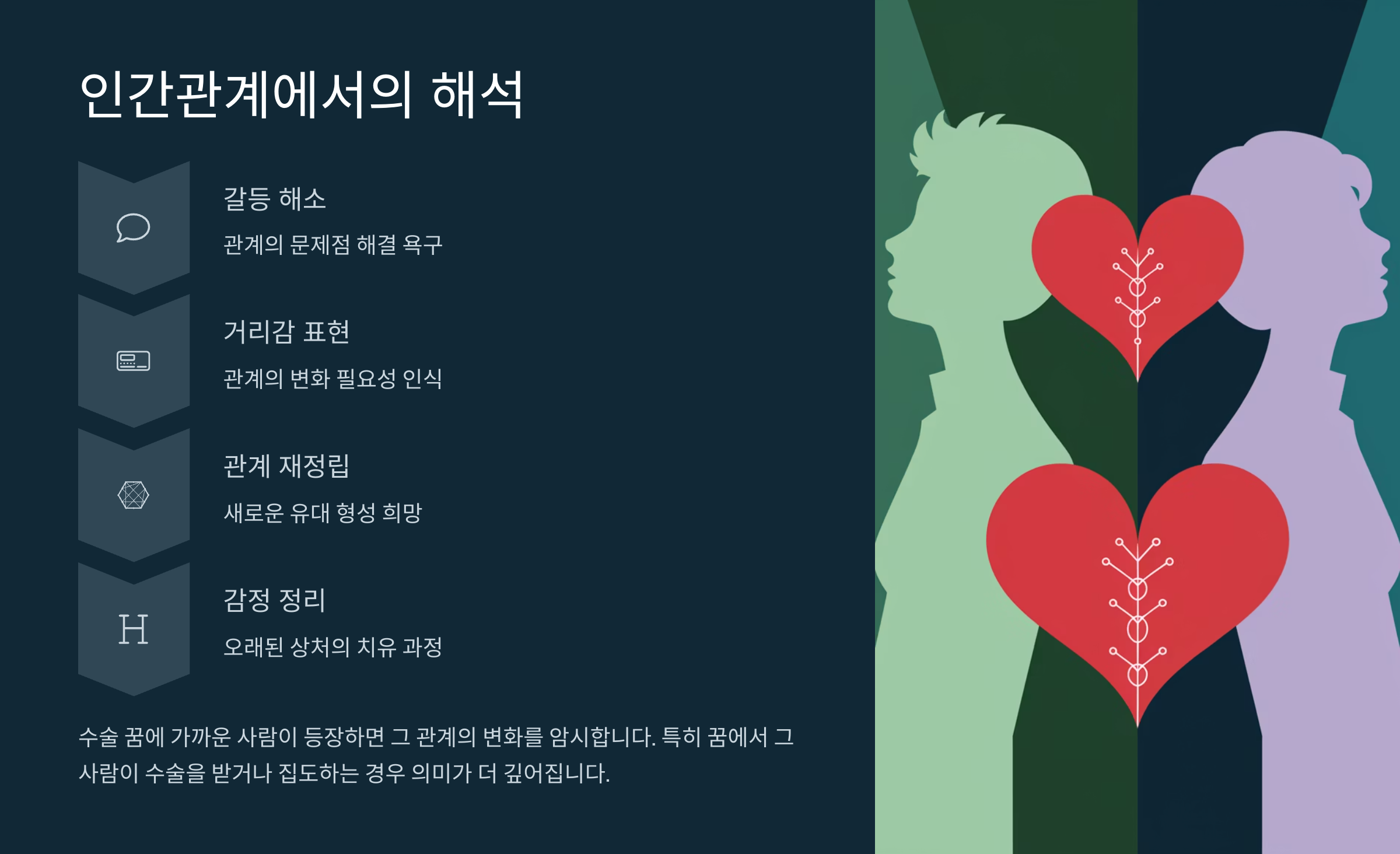 이처럼 수술 꿈은 누군가와의 관계에서 오는 스트레스나 불편함을 무의식이 알아채고 보내는 신호일 수 있어요. 가끔은 이 관계를 정리해야 하는 시점이라는 걸 꿈이 먼저 알려주는 거죠. 너무 억지로 끌고 가지 말고, 마음이 편해지는 방향을 고민해보는 것도 중요해요. 💬