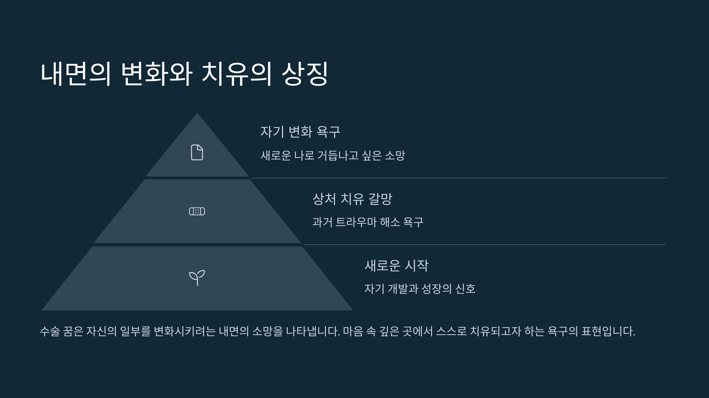 수술 받는 꿈은 단순히 몸의 변화만을 뜻하지 않아요. 이 꿈은 종종 감정적인 문제나 오래된 트라우마를 치유하는 상징으로 해석돼요. 특히 오랫동안 안고 있던 고민, 후회, 죄책감 등이 이제는 사라지고 정리되는 시기가 왔다는 무의식의 신호일 수 있어요.