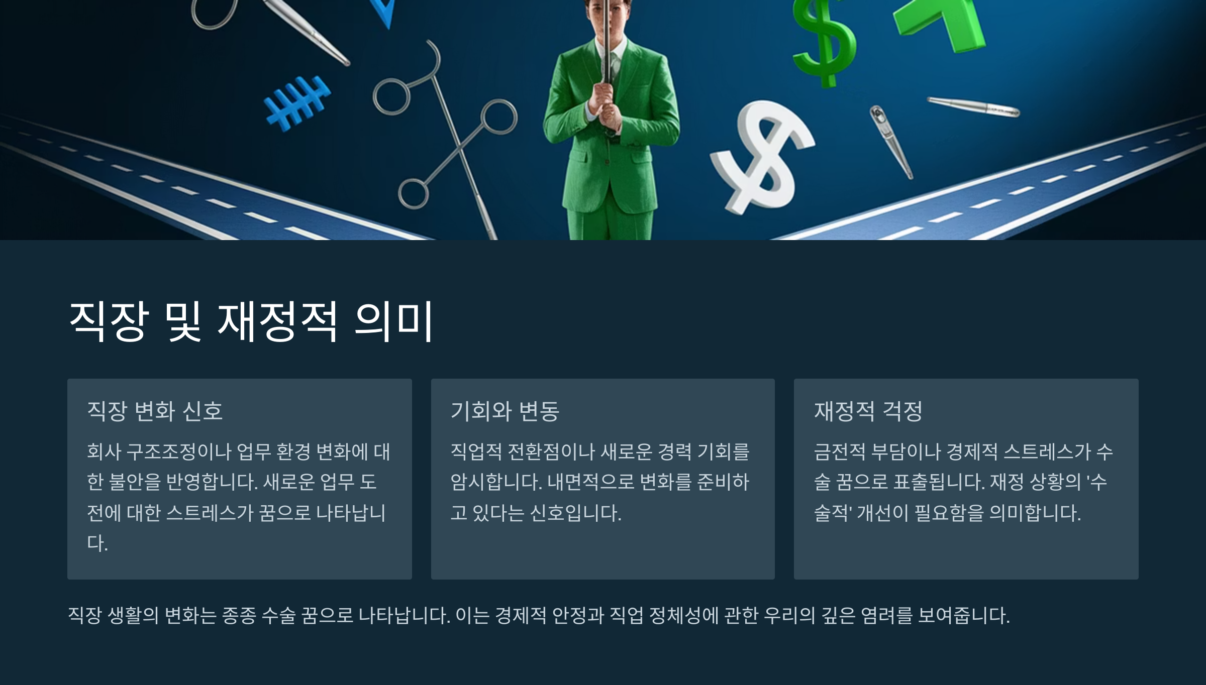 직장과 돈 문제는 누구나 민감하게 반응하는 부분이라서 꿈에도 자주 나타나요. 수술이라는 강한 상징은 ‘이대로는 안 된다’는 경고일 수 있고, 동시에 ‘곧 정리될 거야’라는 위로일 수도 있어요. 내 상황에 따라 해석이 달라지니, 자신에게 맞게 받아들이는 게 중요하답니다. 😊