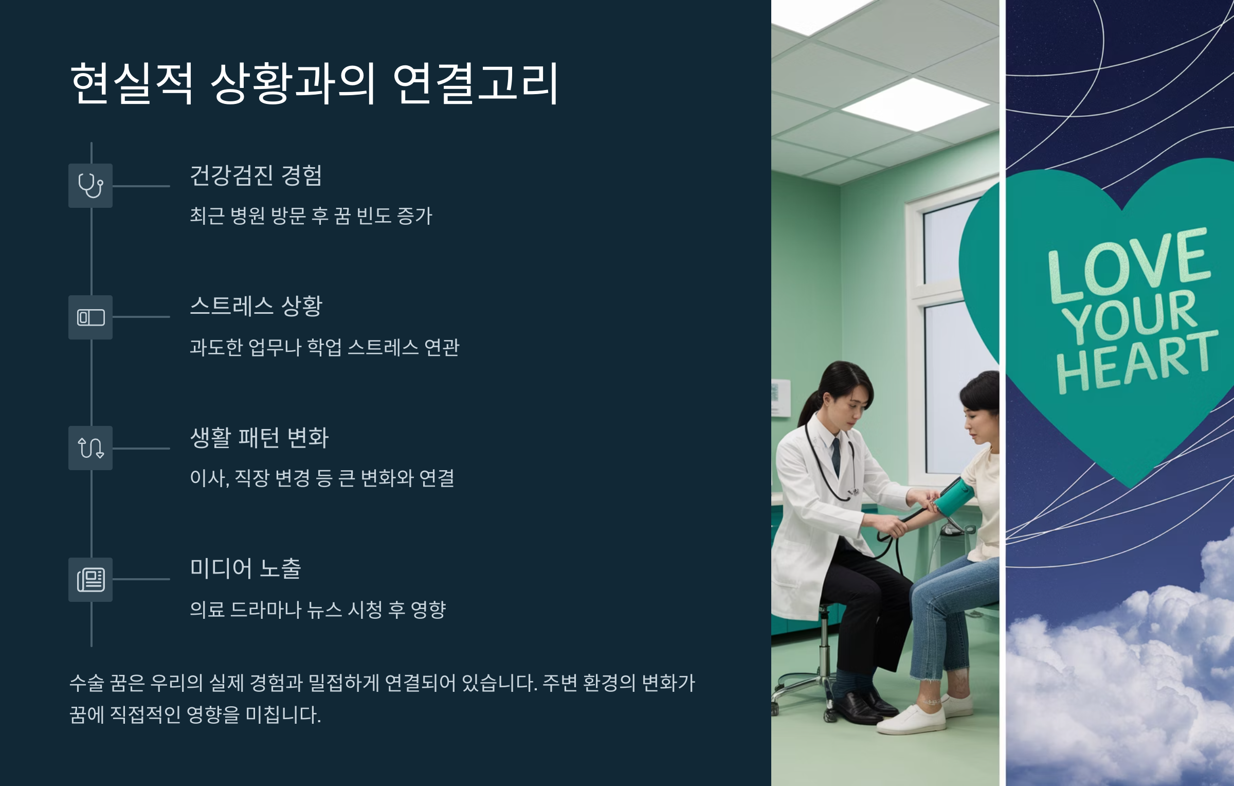 내면적으로 큰 결정을 내려야 할 시점에 이런 꿈을 꾸는 경우가 많아요. 예를 들어 직장을 그만두려고 하거나, 인간관계를 정리하려고 하는 상황에서는 '수술'이라는 상징이 무언가를 잘라내고 새로운 나로 다시 태어나려는 과정을 나타내죠.