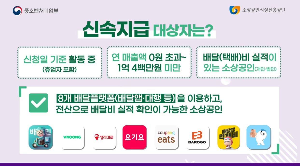 지난 2월 1차로 ‘신속지급’이 먼저 이루어졌고, 이번 4월 21일부터는 증빙자료를 직접 제출하는 ‘확인지급’이 본격 시행됐어요. 특히 직접 배달하는 소상공인도 신청할 수 있게 되어 놓치면 아쉬운 기회랍니다!