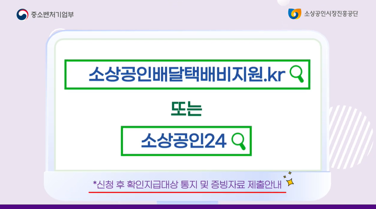 이번 확인지급은 소상공인이 스스로 증빙자료를 제출하는 방식이에요. 신청은 두 곳에서 가능해요. 바로 👉 소상공인배달택배비지원.kr 또는 소상공인24예요.