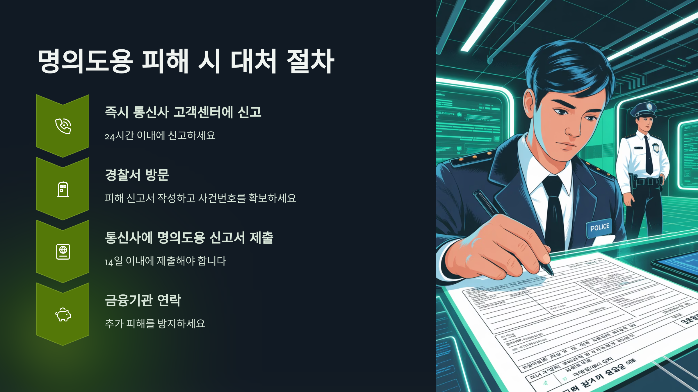 휴대전화 명의도용이 의심되거나 피해 사실을 알게 됐다면, 즉시 다음과 같은 절차를 따라 대응해야 해요. 빠르게 조치할수록 추가 피해를 막을 수 있고, 통신요금 청구나 신용불량 등록 등의 부작용도 줄일 수 있어요.