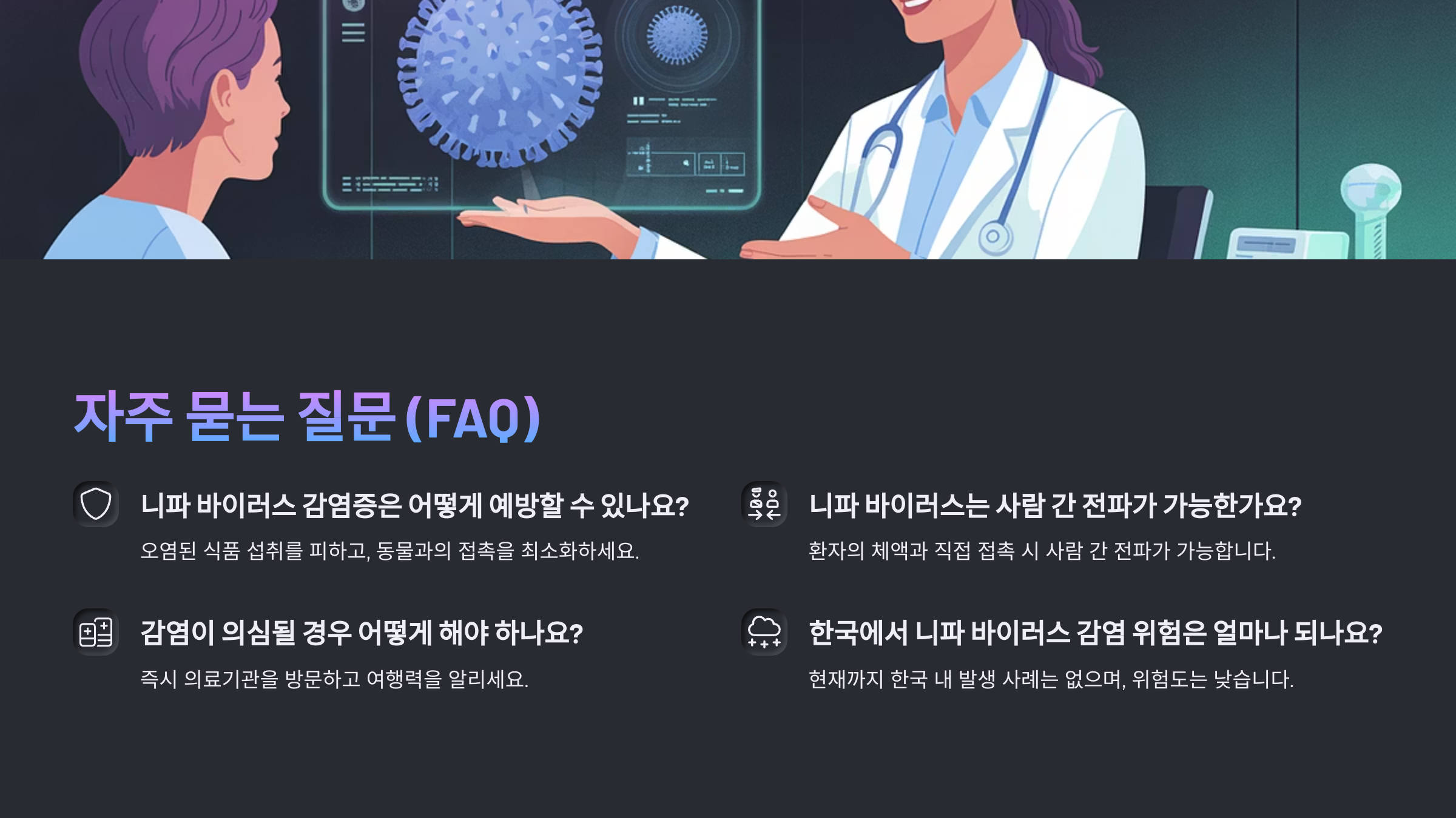 자, 이제 본격적으로 니파 바이러스에 대해 하나하나 알아볼게요! 아래에는 니파 바이러스의 기원부터 감염 경로, 증상, 진단, 치료, 예방까지 자세히 정리했어요. 만약 증상에 대해 궁금해서 찾아오셨다면, 2번 목차에서 바로 확인할 수 있어요 😊