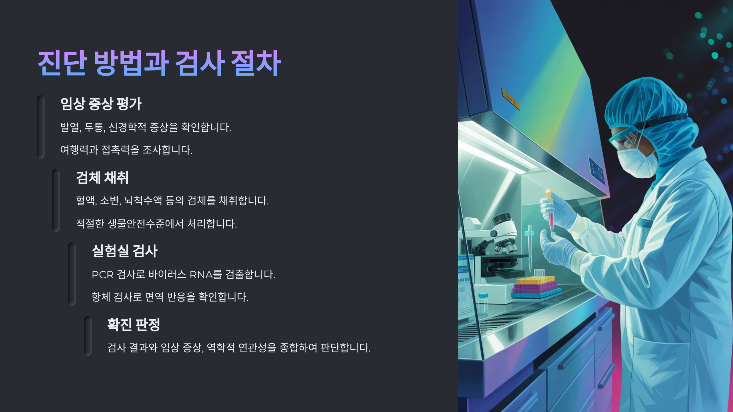 | RT-PCR | 혈액, 침, CSF | 정확도 높음, 조기 감염 진단 가능 | 고가 장비 필요 | 수 시간 내 |