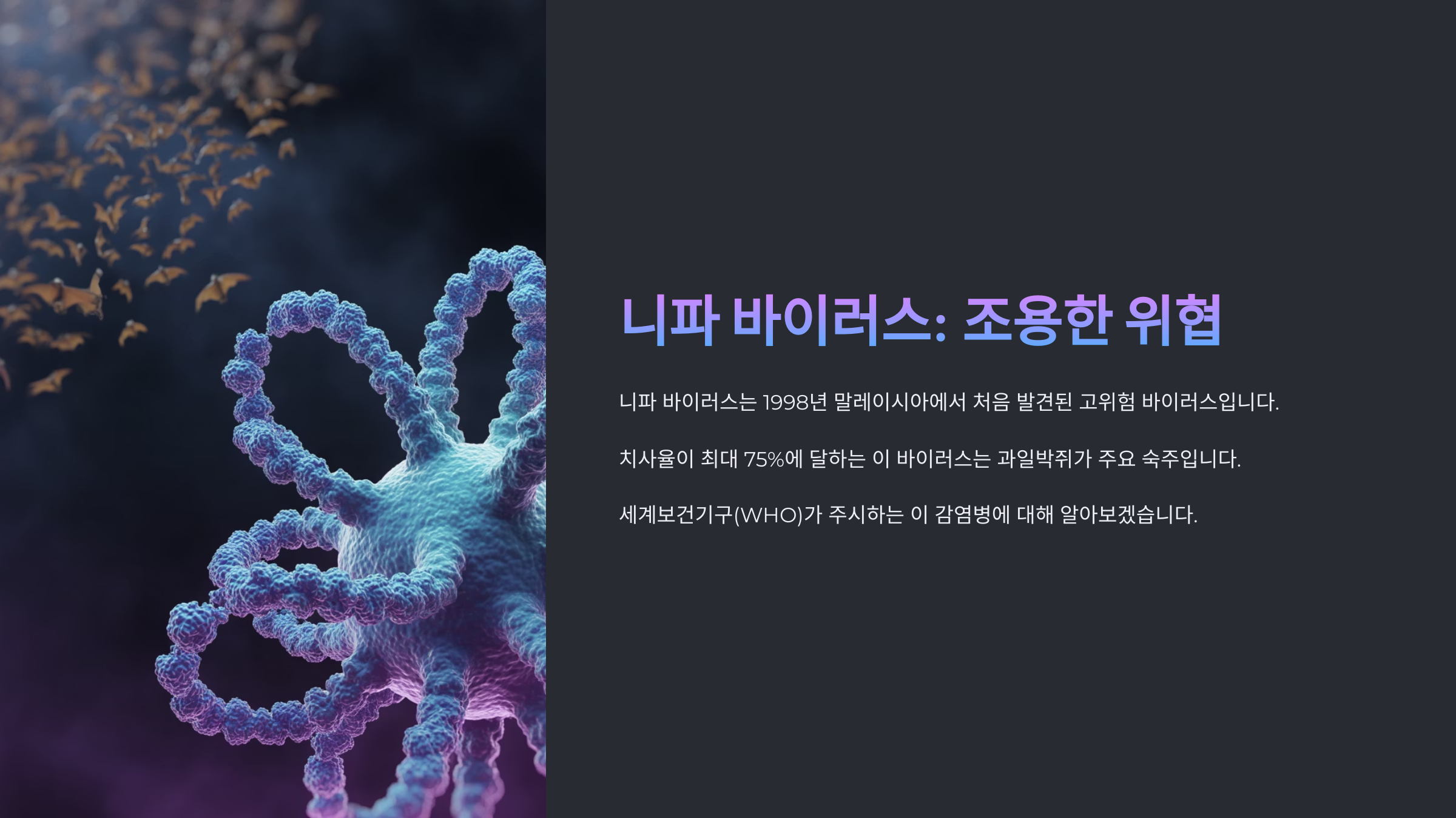 자, 이제 본격적으로 니파 바이러스에 대해 하나하나 알아볼게요! 아래에는 니파 바이러스의 기원부터 감염 경로, 증상, 진단, 치료, 예방까지 자세히 정리했어요. 만약 증상에 대해 궁금해서 찾아오셨다면, 2번 목차에서 바로 확인할 수 있어요 😊