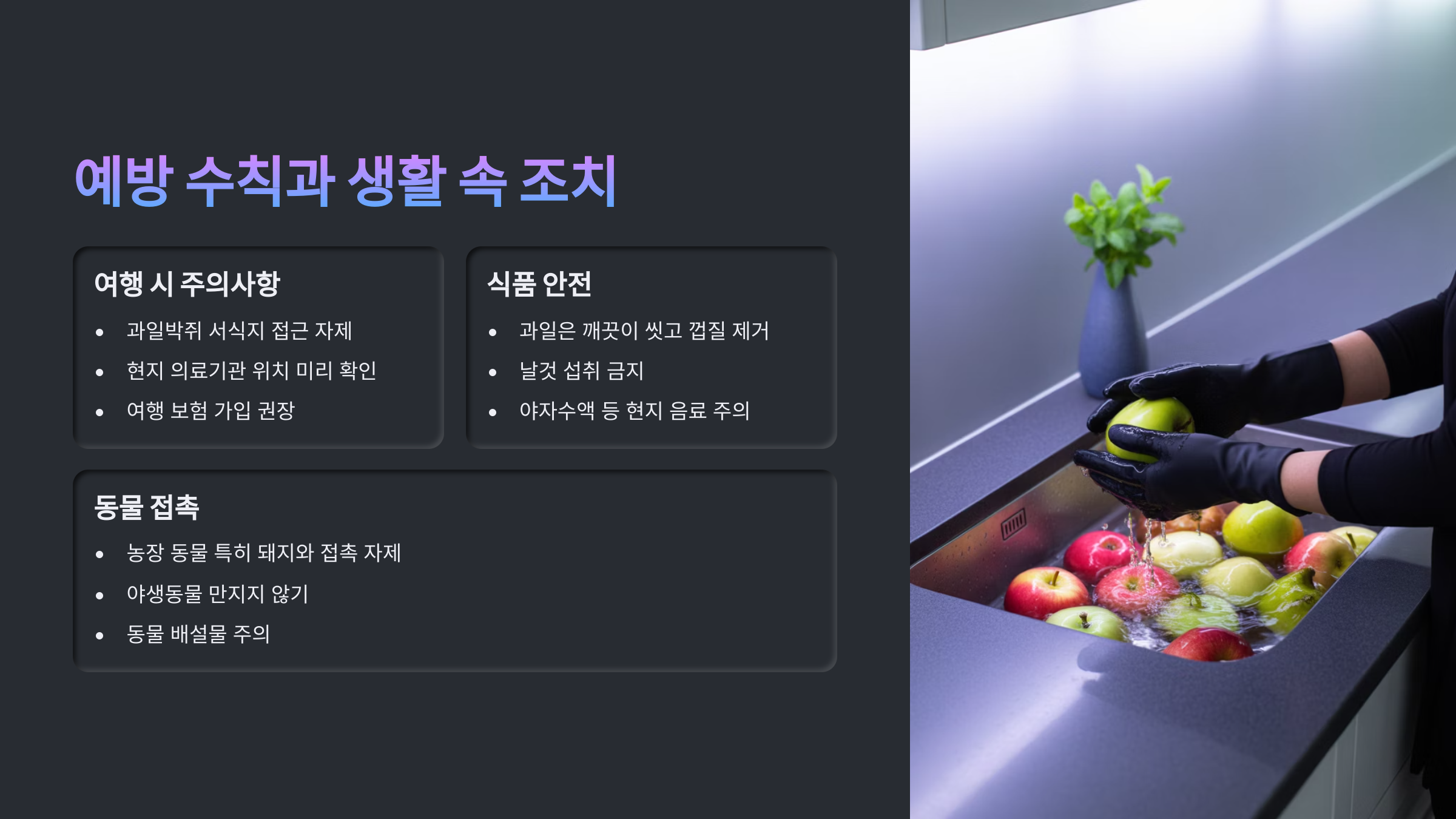 | 과일·수액 주의 | 익히거나 껍질 벗겨 섭취 | 일반인, 여행객 | 매우 높음 |
