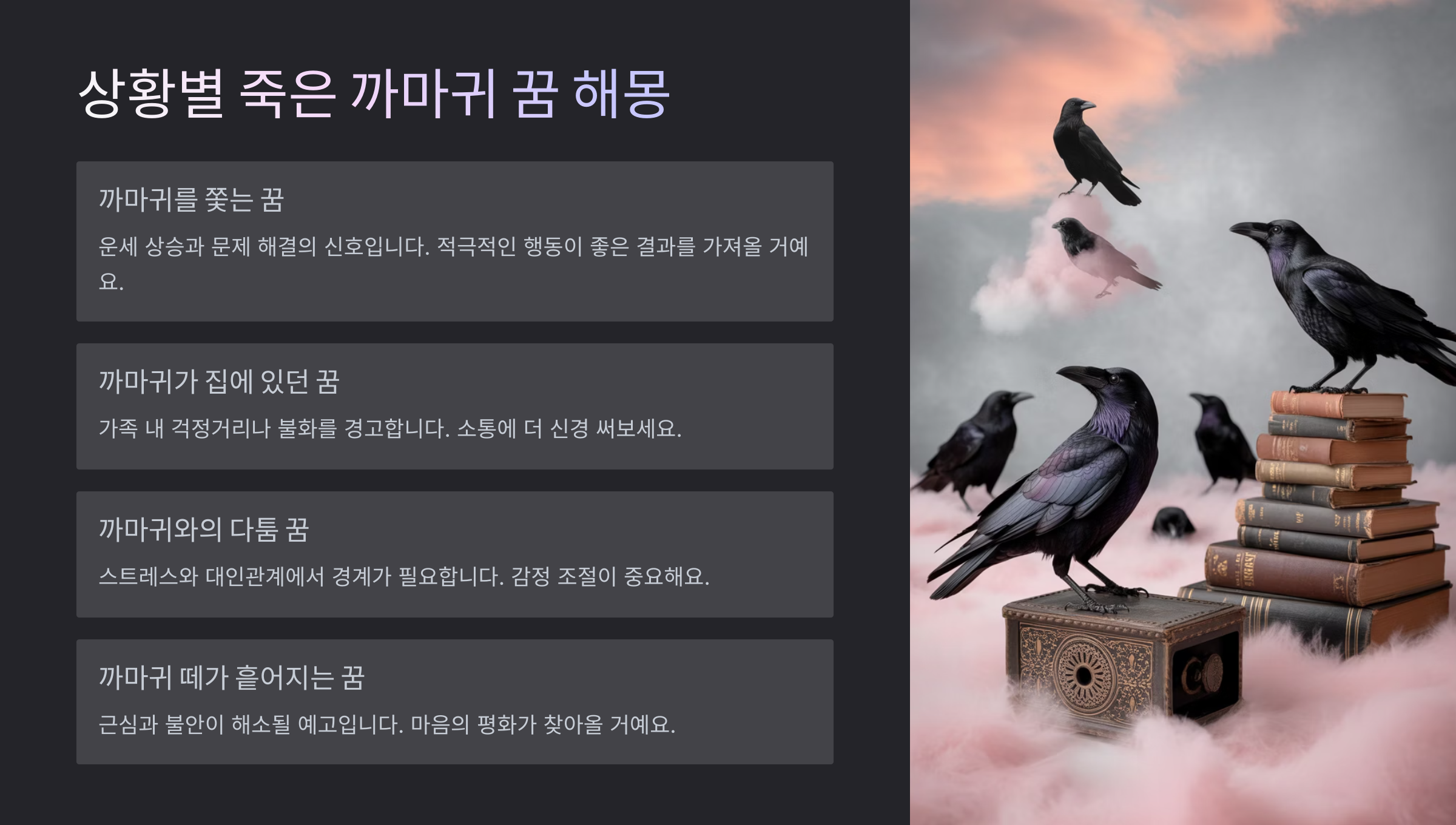 - 상황별 죽은 까마귀 꿈 해몽: 당신의 꿈은 어떤 메시지일까요? 🔍
