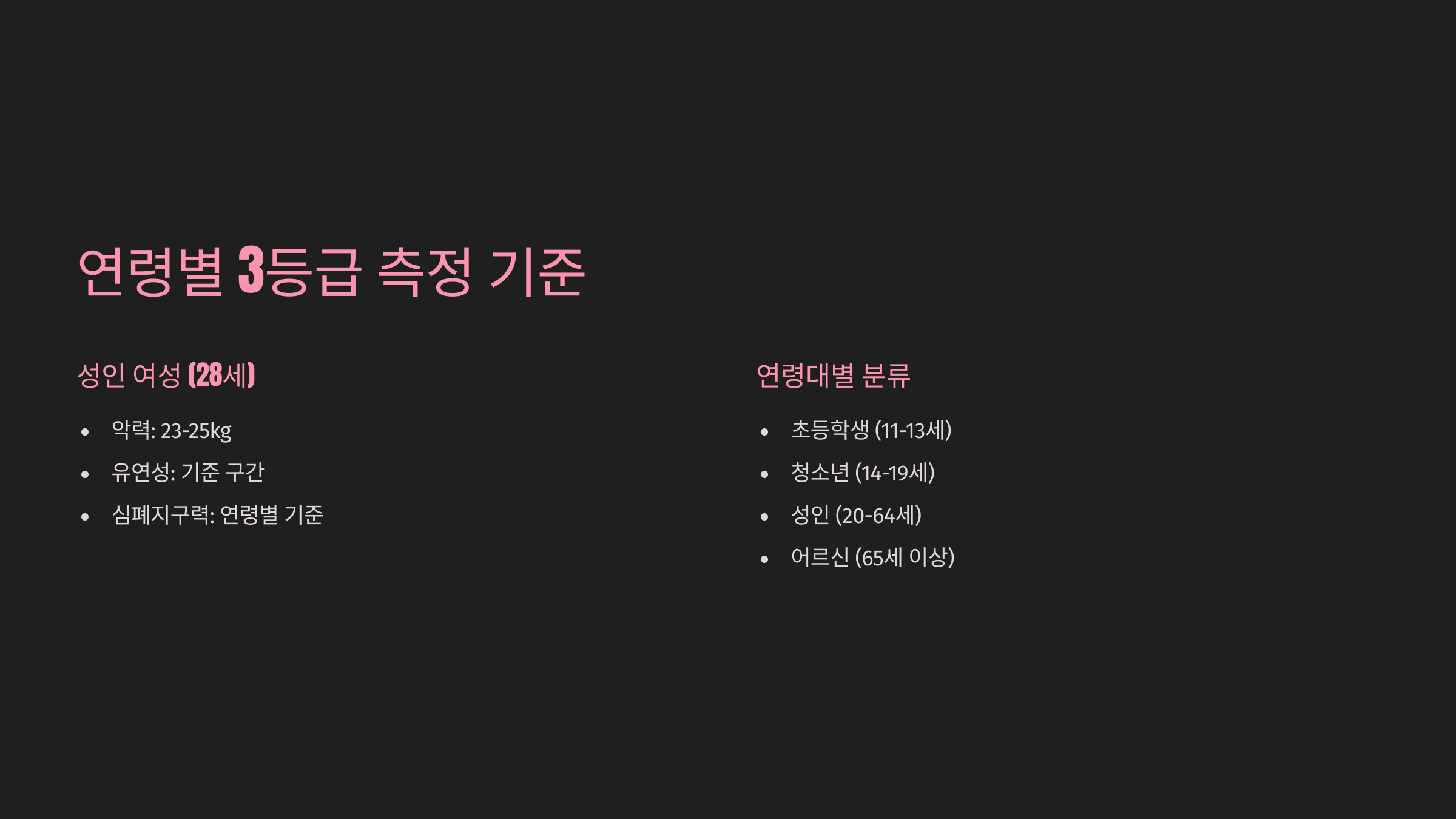 모든 항목은 균형 있게 평가되지만, 심폐지구력과 근력 항목의 영향도가 특히 높아요. 이 두 가지를 중점적으로 향상시키면 등급도 올라가기 쉬워요. 다음 섹션에서는 연령대별로 3등급이 어느 정도인지 실제 수치로 살펴볼게요! 📊