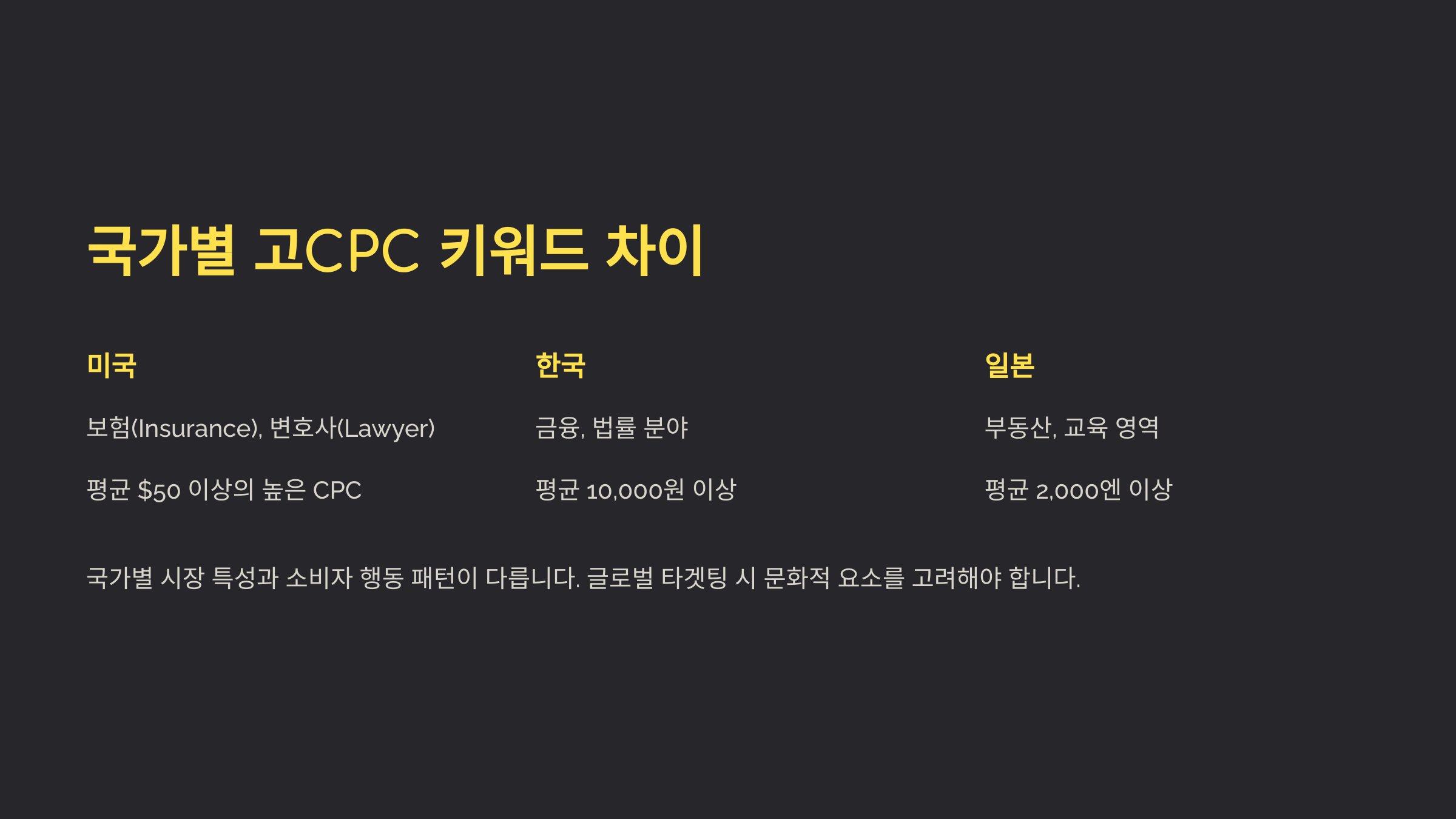 고단가 키워드는 나라별로 크게 달라요. 같은 키워드라도 미국에서는 클릭당 5만원, 한국에서는 1,000원 수준일 수 있어요. 이건 광고 시장 규모, 경제력, 사용자 구매력, 광고주 수요가 다르기 때문이에요.