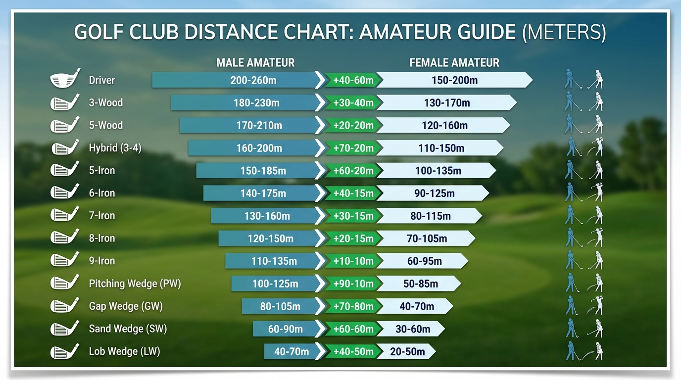 지금까지 살펴본 모든 클럽의 평균 비거리를 한눈에 볼 수 있도록 표로 정리했습니다. 이 표는 아마추어 남성과 여성 골퍼의 '캐리(Carry)' 거리를 기준으로 합니다. 캐리란 공이 날아가서 땅에 처음 떨어진 지점까지의 거리를 의미하며, 굴러간 거리(Run)는 제외된 수치입니다.