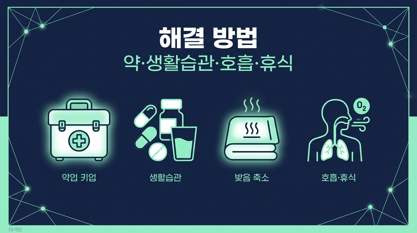바른 자세 유지가 가장 중요합니다. 장시간 구부정한 자세로 앉지 말고 1시간마다 일어나 스트레칭하세요. 규칙적인 유산소 운동과 근력 운동으로 심폐 기능과 근육을 강화합니다. 스트레스 관리를 위해 충분한 수면, 명상, 취미 활동을 즐기세요. 역류성 식도염 예방을 위해 과식과 야식을 피하고 자극적인 음식을 제한합니다. 금연과 절주는 필수이며, 정기 건강검진으로 심혈관질환 위험인자를 조기에 발견하고 관리하는 것이 중요합니다.